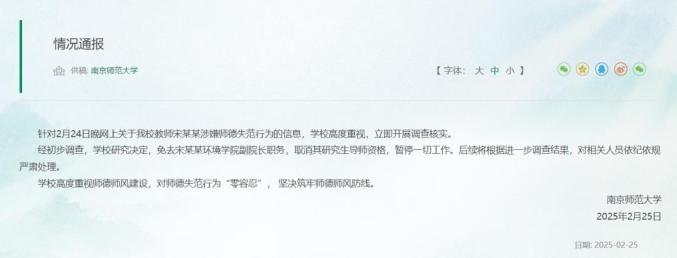 2025年2月24日,一封关于“南京师范大学一学院副院长宋某婚内出轨其所带女博士”的公开信在网络上迅速传播。信中指出南京师范大学环境学院副院长宋某某涉嫌婚内出轨其指导的女博士生,并附有大量聊天记录作为证据。