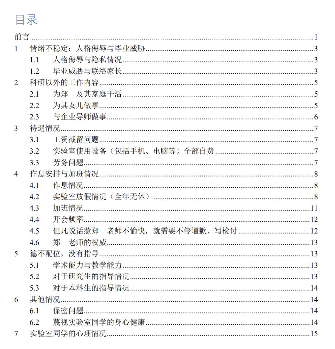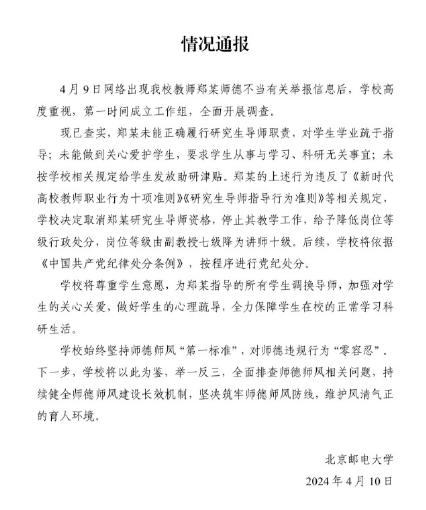 2024年4月9日,北京邮电大学15名研究生联名举报导师郑某存在师风师德问题,称郑某存在谩骂与侮辱、毕业威胁、实验全年无休、克扣学生劳务费;差遣学生长期代取大量快递,替其开车接送朋友、家人,去其家里打扫卫生等问题。同学们说,在巨大的身体压力和精神折磨下,部分学生出现了或轻或重的生理、心理问题。