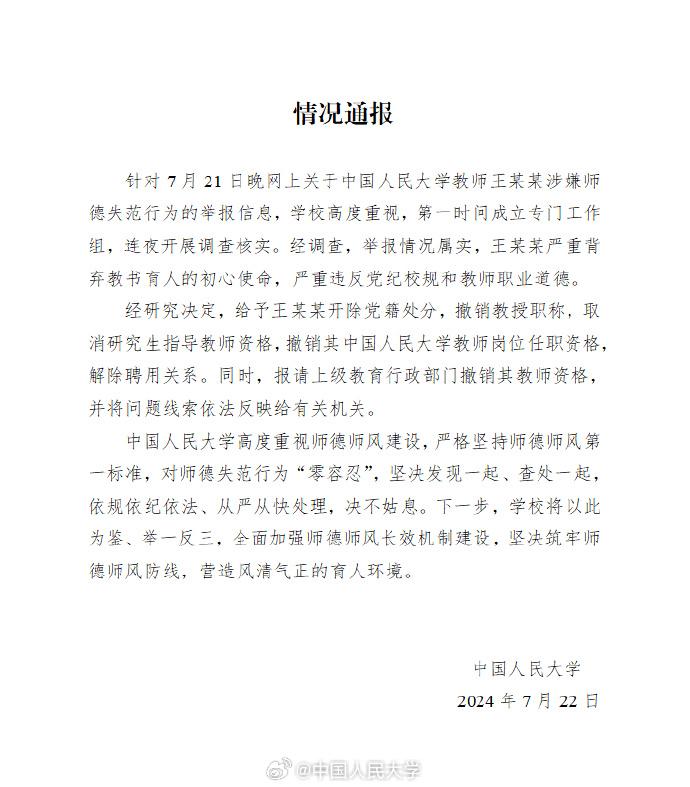 经调查,举报情况属实,王某某严重背弃教书育人的初心使命,严重违反党纪校规和教师职业道德。经研究决定,给予王某某开除党籍处分,撤销教授职称,取消研究生指导教师资格,撤销其中国人民大学教师岗位任职资格,解除聘用关系。同时,报请上级教育行政部门撤销其教师资格,并将问题线索依法反映给有关机关。